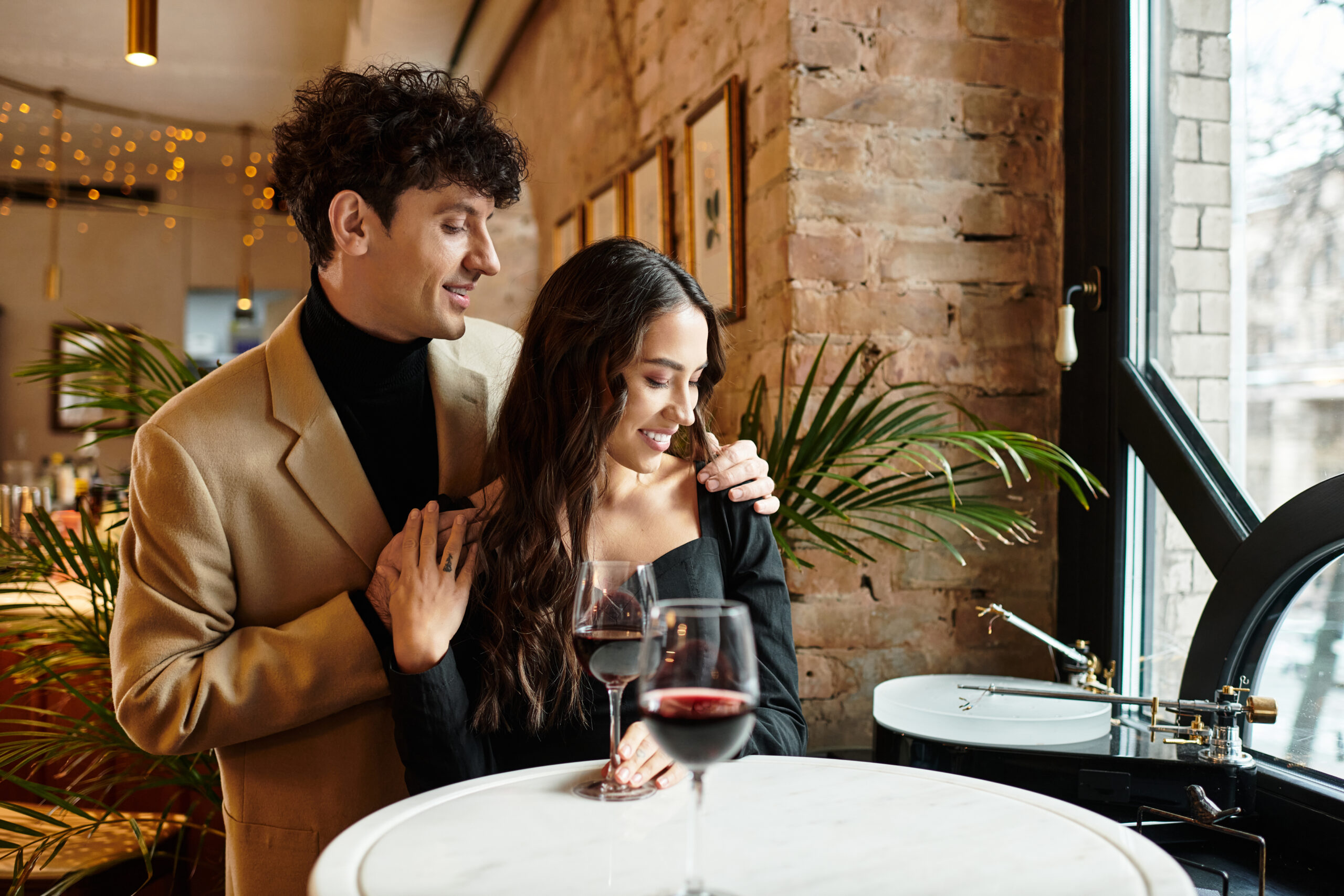 A young couple enjoys an intimate Valentines dinner, sharing smiles and laughter over wine.